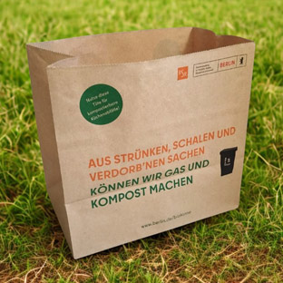 Berlinweite Verteilung von bedruckten Bioabfall-Papiertüten mit Tipps zur Lebensmittelwertschätzung und zur Nutzung der Biotonne für unvermeidbare Lebensmittelabfälle. Die Tüten bieten dabei einen doppelten Nutzen: Zunächst für den Transport frischer Lebensmittel und später zur Sammlung von Bioabfällen in der Küche.