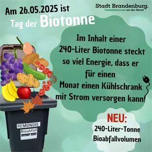Am 31. Mai findet im Naturschutzzentrum der Stadt Brandenburg an der Havel das jährliche Umweltfest statt. Biotonne und Bioabfall werden dort zentrales Thema und Bestandteil der Umweltrallye für Klein und Groß sein.