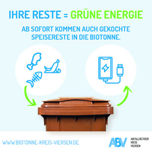 Groß angelegte Kampagne darüber, dass nun auch gekochte Speiseabfälle im Kreis Viersen über die Biotonne entsorgt werden dürfen. Zum Tag der Biotonne ist im Rahmen der Kampagne eine Pressemitteilung und ein dazugehöriger Social-Media-Post geplant.